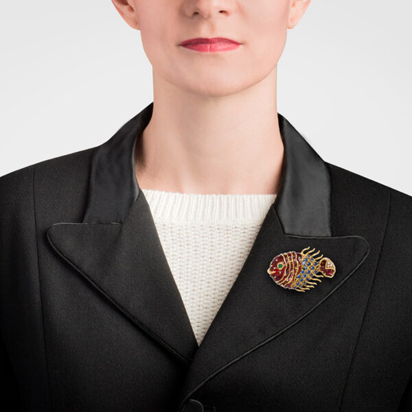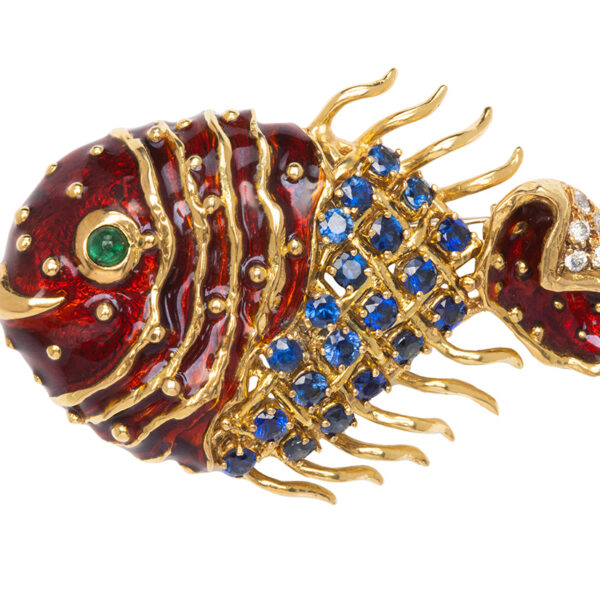 CIPULLO / CARTIER Sapphire/Dia/Emerald Enamel Fish 18k Brooch